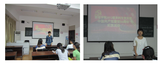 2014年7月1日周二晚19:00,“管理学院2012级本科生党支部庆祝中国共产党成立93周年专题组织生活会”在管理学院502教室召开。会议由支部副书记覃宪清主持,支部书记王老师及支部正式党员和预备党员共计45人参加了会议(1人请假)。