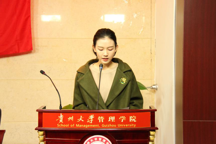 2015级工商管理专业赖心旖同学作为学员代表发言,她谈到:作为一名入党积极分子,首先应该在思想上向中国共产党的最高目标看齐,然后在行动上积极努力地去践行。她还代表所有党校新学员郑重承诺:“我们将以最饱满的热情,最积极的学习态度,最实际的行动来完成我们的党课学习。”