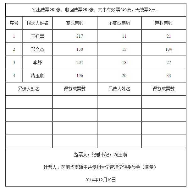 中国共产党贵州大学第三次代表大会代表选举结果计票单