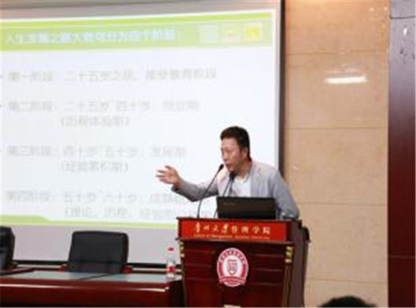 与大家分享了《开启生命的第二旅程!——我年轻,我能!》。林博士将人生分为四个阶段:第一阶段是二十五岁之前,接受教育阶段;第二阶段是二十五岁-四十岁,创业期(历程体验期);第三阶段是四十岁-五十岁,发展期(经验累积期);第四阶段是五十岁-六十岁,成熟稳定期(理论、历程、经验的总结期)。林博士认为在创业期要能清醒地认识自己、选择适合自己的职业/创业目标、关注社会需求、努力工作、与正能量的人共事、聚焦社会、不盲目并抓住机遇;第二阶段是追求成为情感幸福、事业有成、经验丰富的成功人士的阶段,大学生要在此阶段实现自我超越、自我完善。
