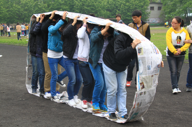 脚下是默默随风摇曳的青草,和煦的阳光慵懒的躺在部员们的身上,本来就沉浸在活动欢乐中的部员显得更加喜悦了。此时,北区老操场赫然已变成了一片欢乐的海洋。此次活动随着主持人的讲话正式拉开序幕,主持人一开始先耐心的向大家交代了此次活动的大概流程,接着便直接进入了活动中最令大家期待的游戏环节。游戏的顺序依次是开火车、无敌风火轮、合力吹气球、K”7“比赛,当然这其中还包括了跟经济学院的友谊拔河。每一个游戏大家都非常积极的参与,部员们在游戏中表现得十分活跃,整个老操场感觉就快被大家的呐喊声震裂了。其中场面最为激烈的非无敌风火轮这个游戏环节莫属。这个游戏的规则是8人一组利用报纸和胶带制作一个可以容纳全体团队成员的封闭式大圆环,将圆环立起来全队成员站到圆环上边走边滚动大圆环,在规定的时间内到达目的地。到达目的地时按所需时间长短来记录成绩,所需时间短的分数就高。在制作大圆环的过程中有的队伍像热锅上的蚂蚁忙得不可开交,而有的队则是表现得有条不紊,大家都在利用自己的智慧力图将大圆环做得结实耐用。大约15分钟后 ,各队的道具都已经制作完毕。比赛就要开始正式的角逐了,得胜的关键不单是考验道具的优劣也需要团队的配合,所以比赛不到最后一秒谁也没法预知哪支队伍会是最后的翘楚。比赛过程中各种搞笑状况层出不穷,特别是有的风火轮甚至在半路就被队员们的脚分解了,有的“娘子军团”居然走出了自己的轮圈。约30分钟过后,各队纷纷拖走了队伍残缺不堪的“战轮”,从部员们的脸上不难看出大家都还意犹未尽。