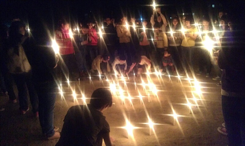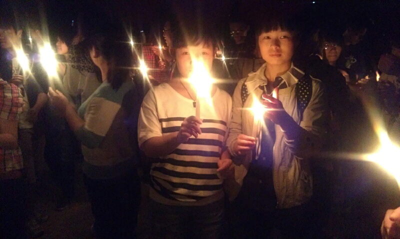 晚7时,志愿者们来到南区大操场,左手高举手机,右手拿着卡片写下他们的祝愿,他们希望让这些灯光点亮整个操场。200多位同学开始在大操场点燃蜡烛,歌唱“爱与希望”祝福雅安,并观看志愿者们精心制作的视频。