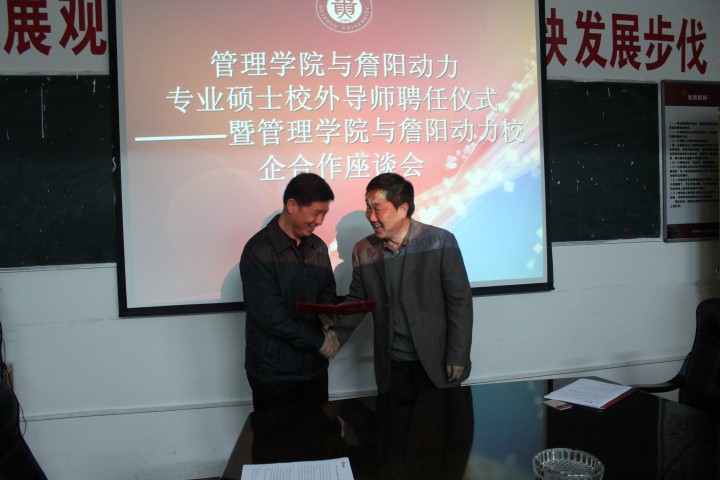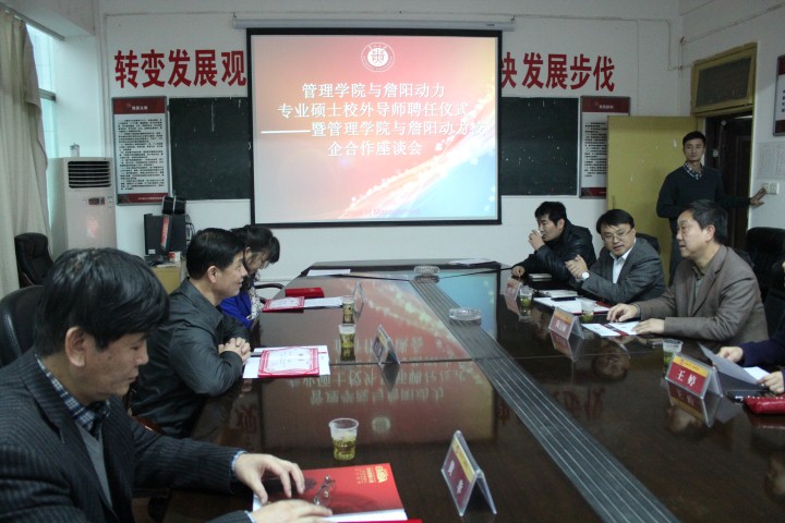 2013年11月20日下午,在官方网站三楼会议室成功举行了“管理学院与詹阳动力专业硕士校外导师聘任仪式暨管理学院与詹阳动力校企合作座谈会”。