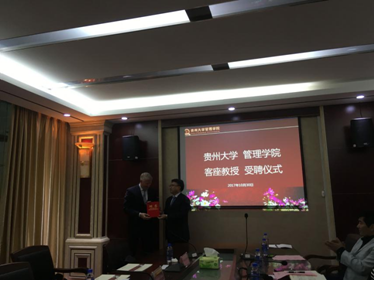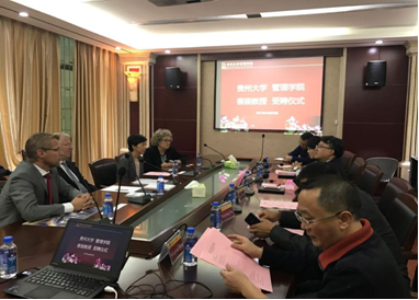 座谈会分为两个阶段。首先是受聘仪式,李烨院长为贵州大学客座教授鲁迪院长颁发证书。第二阶段是鲁迪院长就EMBA和EDP发展问题做报告,双方进行交流,围绕企业MBA案例分析、高级管理培训和师资开发共同商讨两校合作事宜,并探讨财务管理、会计、工商管理等专业的国际化标准教学改革需求。会议期间双方都表达了加强两校开展科研合作交流的意愿。