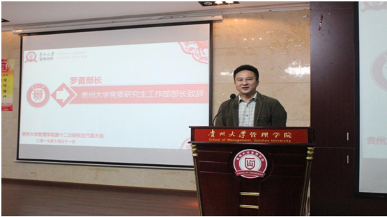 大会在庄严肃穆的国歌声中开始,校党委研究生工作部罗勇部长致开幕辞,罗部长高度认可和肯定了管院研究生会在过去几年工作中所取得的优秀成绩,在中国特色社会主义进入新时代之际,他希望广大同学能深入学习贯彻“十九大”精神,深刻理解学习习近平总书记在贵州大学“5·9”重要讲话精神,希望新一届研究生会在学习生活工作中发挥先锋模范作用,传承管院团结精神,不忘初心,砥砺前行。