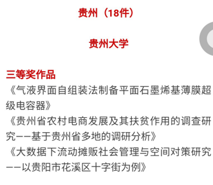 11月19日,由共青团中央、中国科协、教育部、全国学联主办的第十五届“挑战杯”大学生课外学术科技作品竞赛全国总决赛已经在上海大学落下帷幕。贵州省共有18件作品入围全国总决赛,其中有8件作品获得赴上海大学决赛现场答辩的资格。贵州大学有3件作品入围全国总决赛,2件作品获得现场答辩资格,其中包括管理学院研究生“黔途”团队作品《贵州农村电商发展及其扶贫作用的调查研究--基于贵州多地的调研分析》。