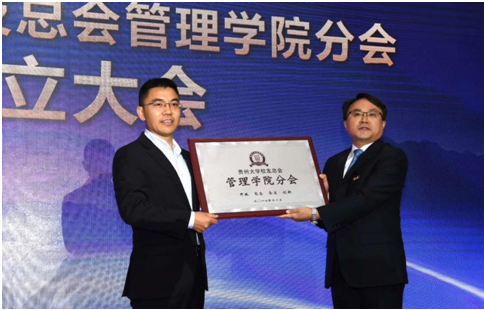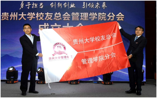 随后,贵州大学对外合作处(校友总会)处长刘治军和管理学院院长李烨共同为管理学院校友分会成立揭牌和授旗。