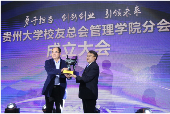 随后,贵州大学对外合作处(校友总会)处长刘治军和管理学院院长李烨共同为管理学院校友分会成立揭牌和授旗。