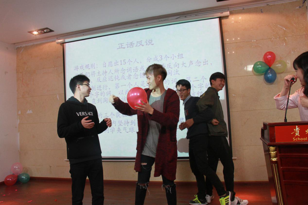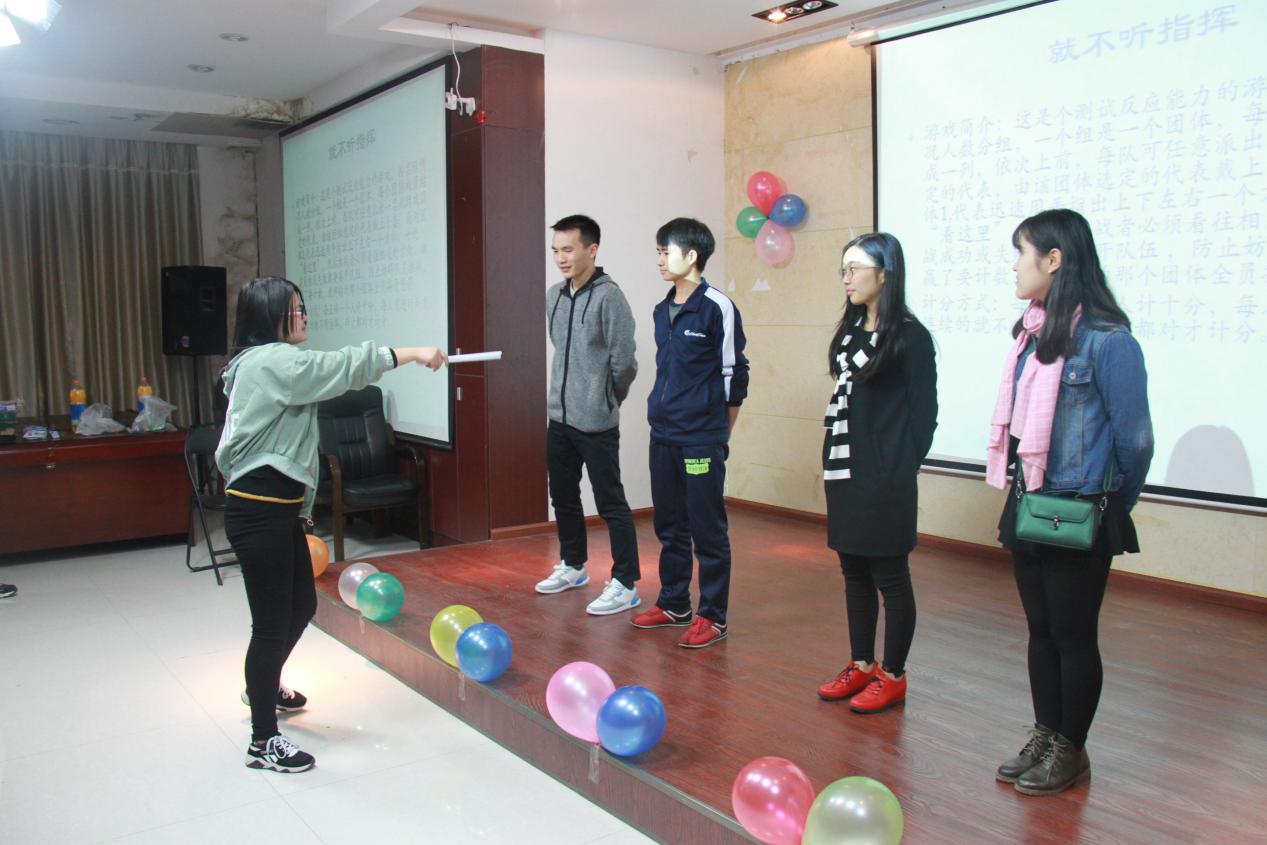 线上活动结束便是线下游戏。第一个游戏:就不听指挥,活动内容如下:现场观众一个组是一个团体,每个团体成员站成一列,依次上前,每队可任意派出一名此游戏固定的代表,由该团体选定的代表戴上手套,面对团体1,代表迅速用手指出上下左右一个方向,并说“看这里”,然后挑战者必须看往相反的方向。挑战成功或失败都要离开队伍 ,防止妨碍队友挑战,赢了要计数,最终输的那个团体全员接受惩罚。此次游戏根据得分统计,得分最低的小组的成员每个人必须用嘴吹破一个气球。每一位现场观众都参与到了游戏当中,大家十分活跃。游戏过后由邓伟同学为大家带来了一段吉他演唱节目,颇受欢迎。