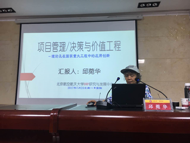 邱菀华教授此次学术报告的主题是“项目管理/决策与价值工程”。邱教授首先对项目管理/决策(PMD)与价值工程(VE)的研究背景做了简述,并指出现如今我国的国家重大工程项目管理面临着很多严峻的挑战。为此,邱教授卅年来,致力于复熵知识与验证体系的研究,并将此应用于项目管理优化应用方法,设计了国产大客机C919、某型航空发动机、嫦娥探月卫星一期、卫星C3I系统、空间飞行器(含神舟)以及L-15飞机等六个国家重大工程的国际联配复熵决策模式与技术,以及通用的风险决策核心模块和算子,实现了集成与精准、信息和决策的实时控制并成功应用取得实效。