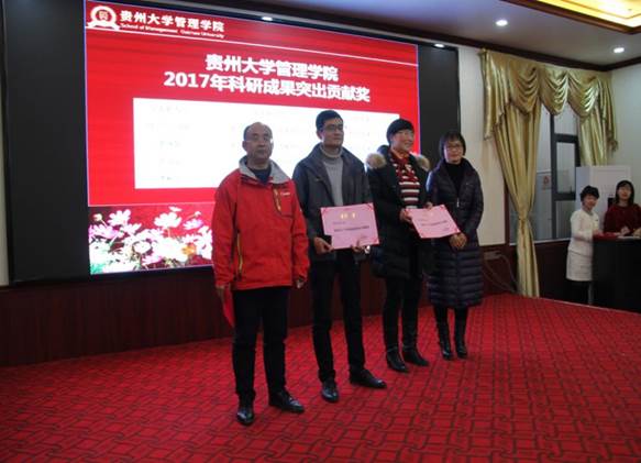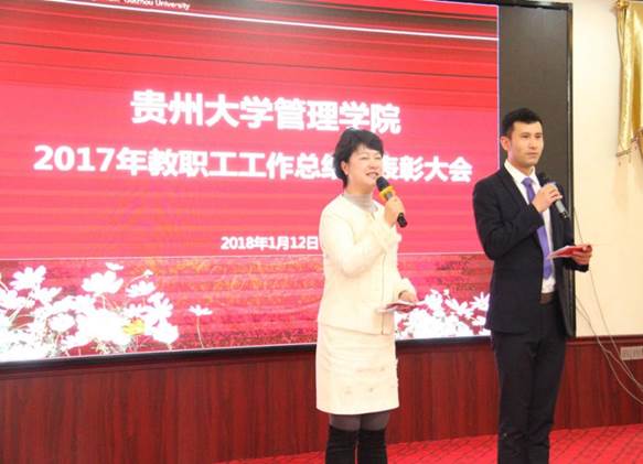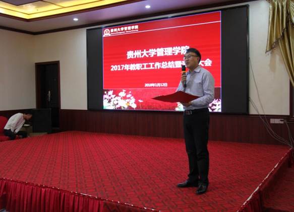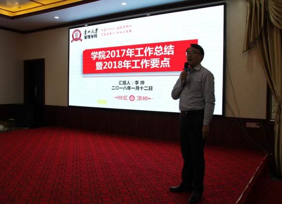 2017年学院召开丰富多彩的大型活动,包括召开第三届第一次教职工暨工会会员代表大、成功举办了2017年教学观摩课活动、承办中华博士会“双创”校园行走进贵州大学活动、承办中国MBA西南联盟“砥砺前行·和合共创”暨中国MBA西南联盟第十二届主席峰会、主办“第十二届玄奘之路国际商学院戈壁挑战赛贵州大学EMBA出征仪式暨戈壁征服与企业家精神分享会”、协办2017年中国国际大数据产业博览会“大数据与商务创新论坛”、承办第九届娃哈哈全国大学生创客营销实践大赛贵州省答辩暨颁奖仪式、成功主办贵州省第一届MBA管理案例精英挑战赛决赛、承办“学创杯”贵州大学第二届创业综合模拟大赛、成功举办贵州省系统工程学会2017年学术交流会、召开中国EDP教育联盟二〇一七年第二次主任会议和移动课堂、成功举行中国EDP教育联盟首届企业家重走长征路活动、承办第十四届工业工程应用与推广及人才培养研讨会暨第十七期高等学校工业工程专业暑期教师培训班、承办的第二届哲学社会科学智库名家·贵州学术年会暨贵州省深化供给侧结构性改革研讨会、召开“深入学习十九大精神 奋力推进双一流建设”为主题的教职工大会、召开党委中心组(扩大)理论学习会议并深入学习贯彻党的十九大精神、举办“大扶贫•贫困脆弱性治理”论坛、开展深入学习宣传贯彻党的十九大精神报告系列讲座等。李院长分别从队伍建设(含人才引进、师资培养、学历提升、考核与聘岗)、人才培养(含本科教学、实验室教学、本科生管理、学术型研究生教学及管理、专业硕士学位研究生教学及管理)、科研与学科建设、服务社会(EDP)、对外交流与合作(含国际交流、院企/地合作)、党建、统战、离退休工会等方面向与会人员介绍了学院2017年各项事业的发展情况,并简要介绍了学院2017年工作的亮点,包括研究生科研水平上台阶、本科生助力脱贫攻坚献力量、新媒体运用初显成效、关注学生心理健康、对外合作交流成绩突出、国际交流与合作成绩斐然、EDP(高级管理培训)硕果累累、承办国际/国内大型会议、深入学习宣传贯彻党的十九大精神报告系列讲座、首批青年博士教师成功进驻校外教学实践基地等。