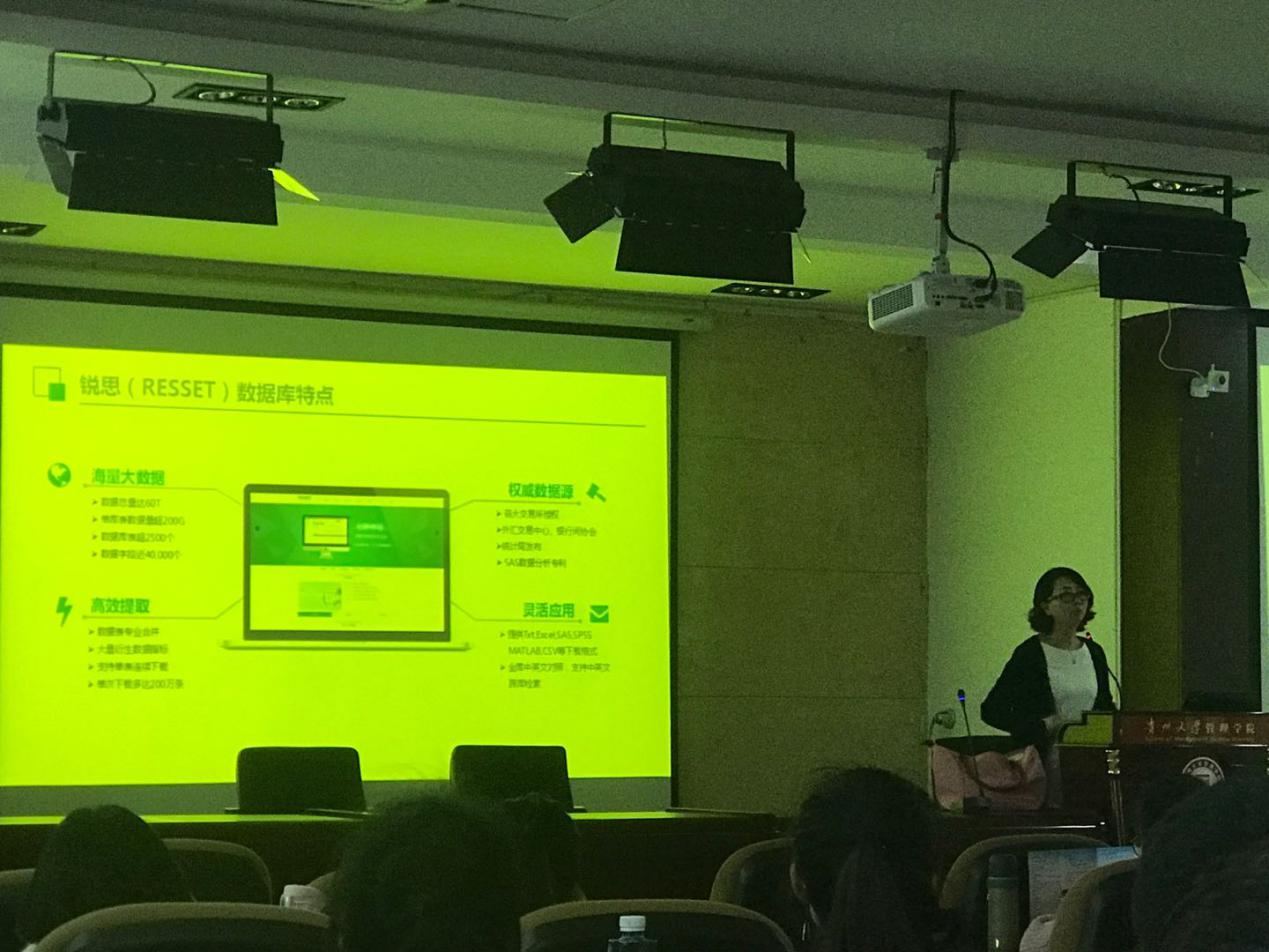 应管理学院邀请,锐思数据库产品使用介绍人于2018年4月11日14:30在管理学院三楼报告厅做了“如何使用锐思数据库获取科研所需数据”的培训讲座。讲座由管理学院副院长王婷教授主持,管理学院全体研究生及部分教授参加。