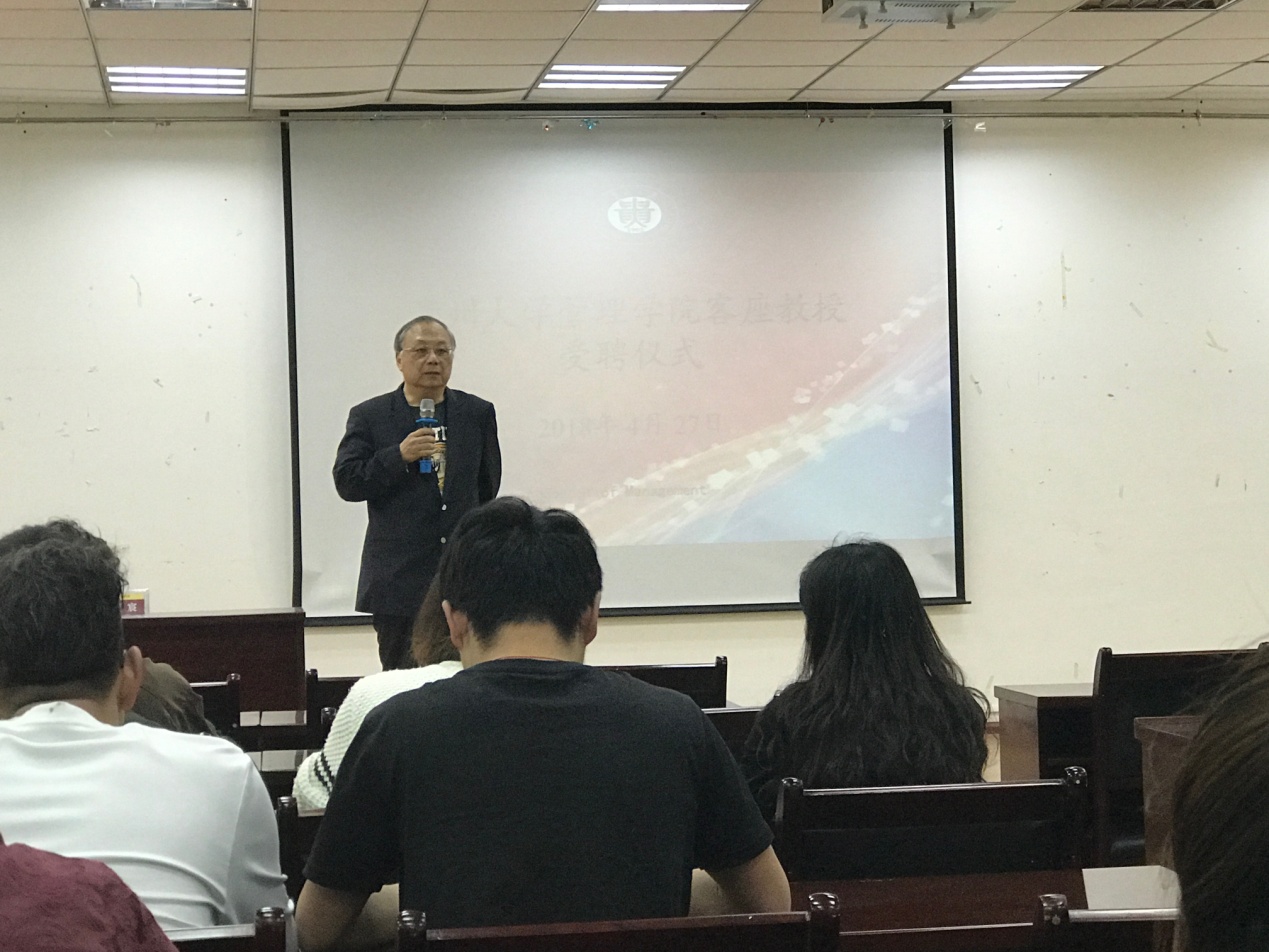 应管理学院邀请,中华大学讲座教授、鸿海富士康集团资深顾问杜紫宸教授于2018年4月27日10:20在MBA二楼报告厅做了“创新与创业的真谛”讲座。讲座由管理学院副院长王婷教授主持,管理学院全体研究生同学聆听。