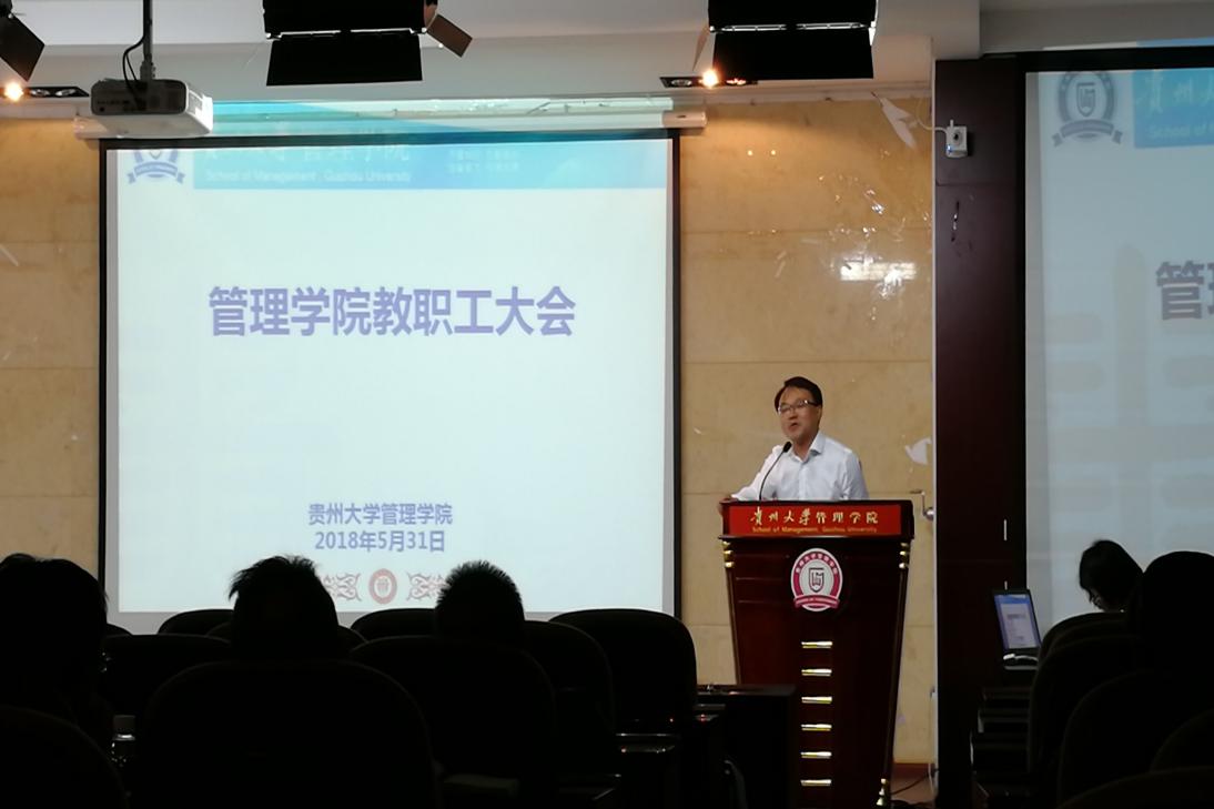 2018年5月31日中午12:40,管理学院在致远楼三楼报告厅召开全院教职工大会。学院领导及教职工参加了会议,会议由学院院长李烨教授主持。