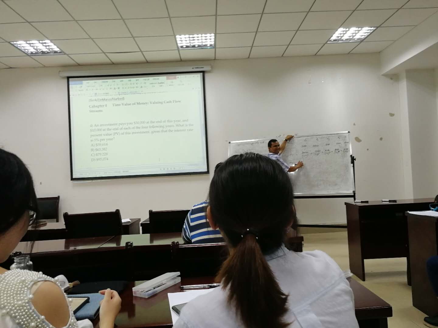 Golam教授在对金融的讲解过程中,不仅仅是对理论和方法进行介绍,还运用贴近生活的案例,通过对案例进行分析讲解,同时邀请同学参与到案例的分析中去,通过进行实际运算,加深了对金融在生活运用中的理解。教授的教学方式大家很喜欢,在计算过程中大家参与其中,重拾课堂之乐,并且用英语沟通也很有趣,大家很喜欢外教课。