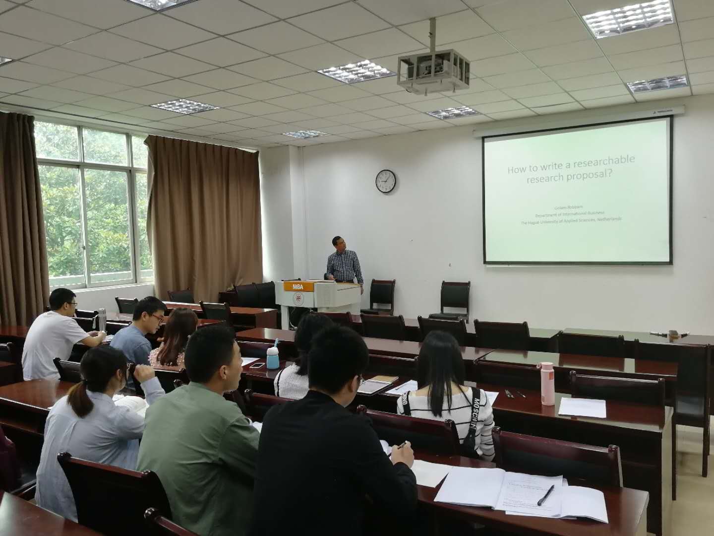 Golam Robbani教授是一位印度裔荷兰人,头发有些花白但人很有活力,对同学们也很友善,他全程用英语给大家交流但尽量在放慢语速来照顾大家的听力和理解。Golam教授先让我们每个人做了自我介绍,迅速拉近了我们的距离,然后他用一个生动的例子为大家解释什么叫“Research”,并以主题为“How to write a researchable research proposal?”展开教学。