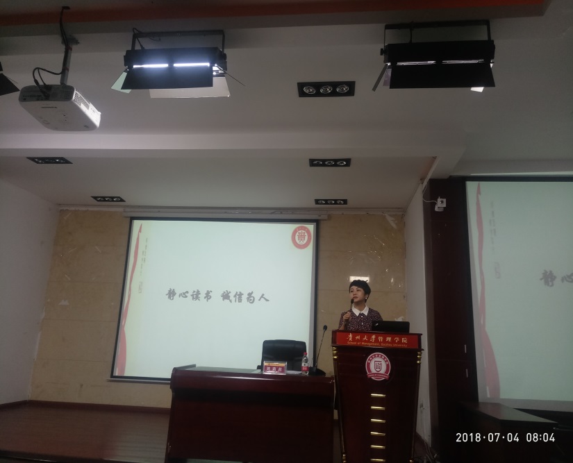 2018年7月4日上午8:00在管理学院三楼报告厅,管理学院2017级全日制研究生(学术型、专业型)开展学习科学道德与学风建设第二次课程。此课程由管理学院研究生辅导员邵美婷老师主持,管理学院副院长周莉莉教授主讲。周教授以“静心读书 诚信为人”为主题开展此次课程。