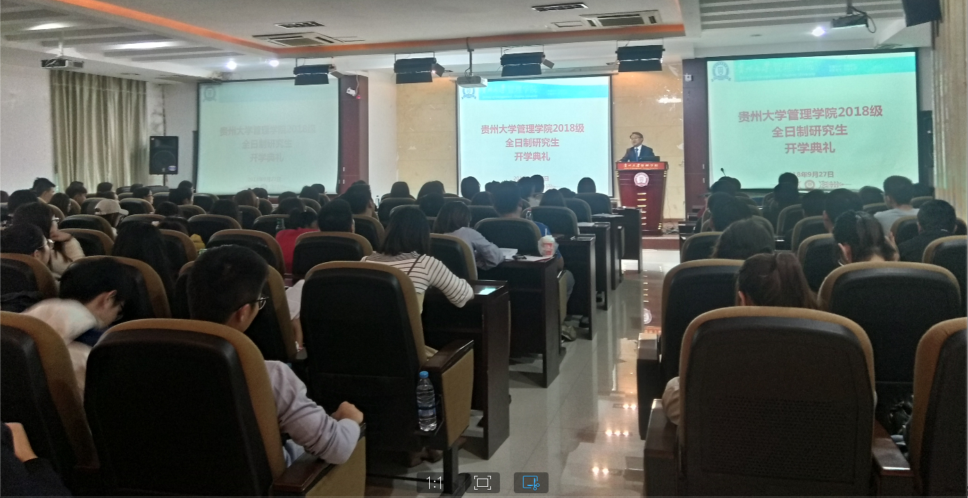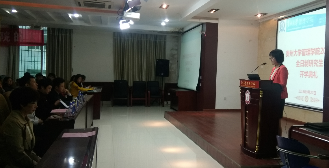 2018年9月27日早上9点,在贵州大学管理学院3楼报告厅举行了2018级研究生新生开学典礼。出席此次典礼的有贵州大学党委研究生工作部罗勇部长、leyu院长李烨教授、副院长王婷教授、副院长周莉莉教授、副院长宋山梅教授和党委副书记张亚军老师、导师代表安海燕教授以及管理学院2018级全体研究生新生。开学典礼全程由管理学院副院长王婷教授主持,她首先代表全院老师对新同学们的到来表示热烈欢迎,并期盼在今后的研究生生涯中能取得骄人的成绩。管理学院院长李烨教授致辞、导师代表安海燕博士发言、老生和新生代表依次发言,研究生工作部罗勇部长对开学典礼进行总结发言。