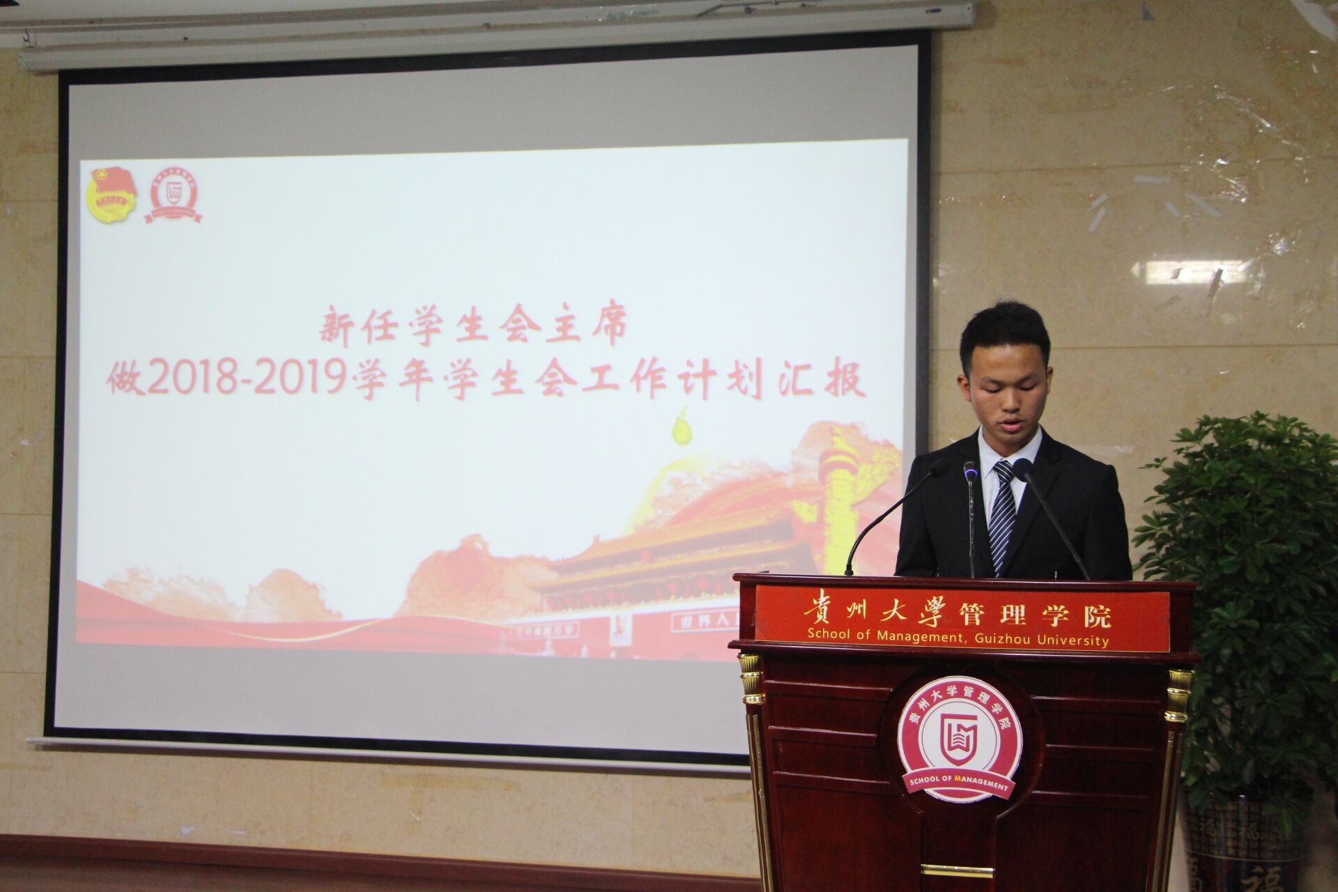紧接着,大会进入宣布第十二届主席团名单工作计划阶段。院学生会秘书长车婧娴老师宣布了新任学生干部名单,由新任学生团委副书记王馨悦同学以及新任学生会主席熊杰同学分别对2018-2019学年团委工作和学生会工作做工作计划汇报,随后团委负责人陈芊羽老师向第十二届团委学生提出了找准定位、完善自我、统筹兼顾等方面的要求,并表达了对其未来的展望。