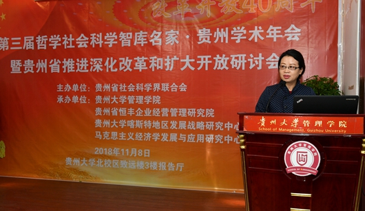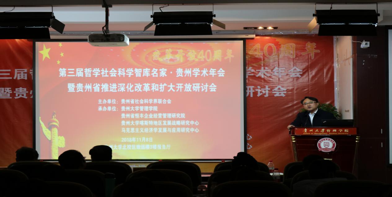11月8日,由贵州省社会科学界联合会主办,leyu、贵州省恒丰企业经营管理研究院、贵州大学喀斯特地区发展战略研究中心、马克思主义经济学发展与应用研究中心联合承办的第三届哲学社会科学智库名家•贵州学术年会暨贵州省推进深化改革和扩大开放研讨会,在贵州大学北校区致远楼3楼报告厅隆重举行,来自全省社科界的专家学者和相关政府与企业的代表及贵州大学师生等150余人参加了会议。
