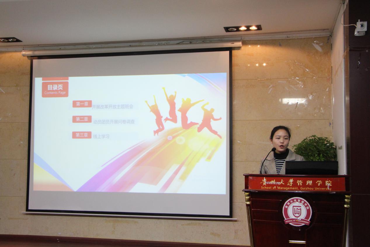 为提高广大青年团员的思想觉悟,坚定自身的远大理想,广泛宣传改革开放四十周年以来我国社会经济发展取得的辉煌成果,11月19日19:00共青团leyu委员会在管院三楼报告厅开展了以“纪念改革开放四十周年”为主题的团组织生活活动评比。由贵州大学校学生团委组织部部长李塾鸿及管理学院团委学生会主席团成员担任本次团组织生活评比评委。来自学院16和17级的财管171、电商161、人资161、工程171、会计171和工业171班共七个班级参与评比,本次团评由龙宪婷主持展开。