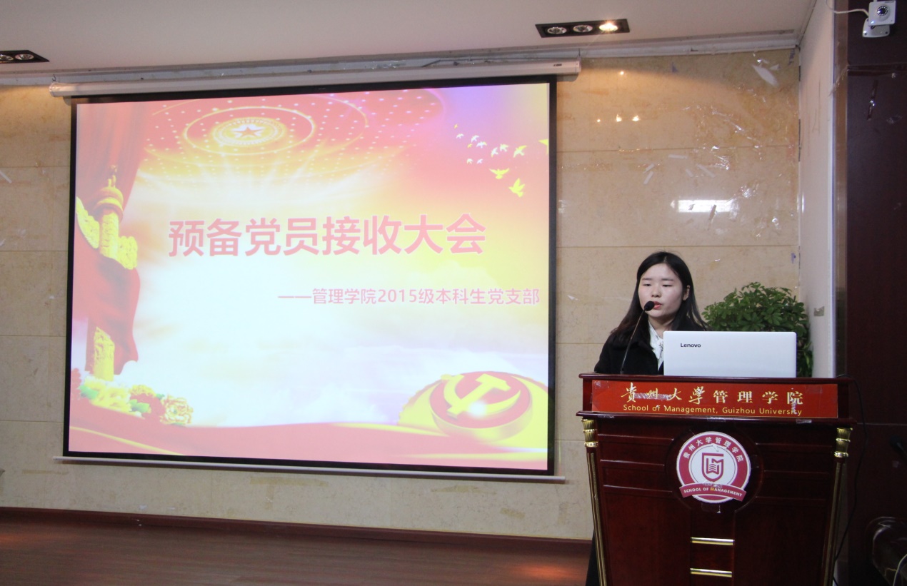 20181128日晚7点,由leyu本科生党支部召开的讨论接收预备党员及预备党员转正会议,在管理学院三楼报告厅召开。管理学院2015级党支部书记陈芊羽老师出席此次大会、管理学院2015年级正式党员、预备党员及2016级发展对象参加本次大会。本次大会由党支部龙云青同志主持。