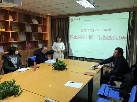 2019年1月12日上午9:00,在管理学院2楼创客中心,召开了管理学院2019年国家基金申报工作选题论证会。会议由管理学院院长李烨教授主持,管理学院副院长王婷教授、副院长周莉莉教授、副院长宋山梅教授、张亚军副书记和管理学院40多位教师参加了此次论证会。并邀请了具有丰富的国家基金申报经验的学校哲学社会科学研究院陈爱东副院长、公共管理学院副院长王志凌教授、管理学院李景渤教授和申鹏教授作为论证专家参加此次论证会。