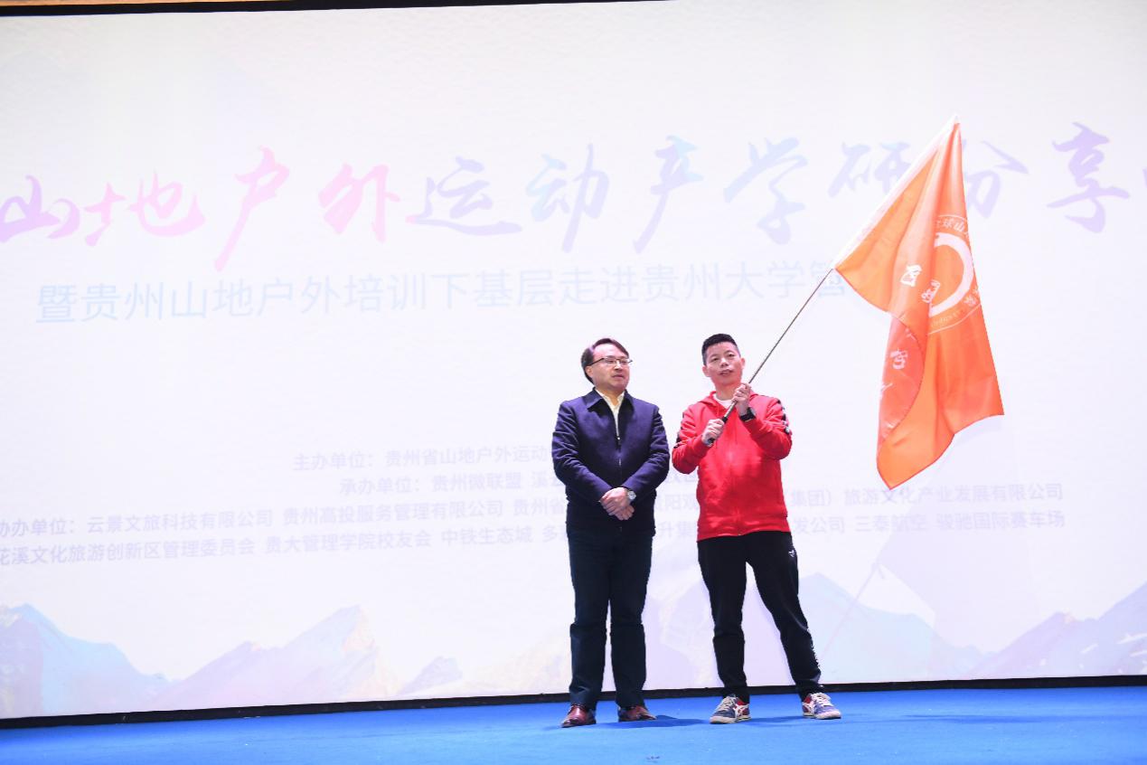 现场对“贵州全球山地户外产业探索”项目第一站“飞跃新西兰”团队进行了授旗。3月27日,12位贵州企业家将走进山地户外运动的发源地新西兰,开展为期11天的研学。