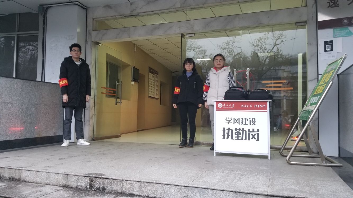 冬去春来,新学期如约而至。为进一步官方网站学风建设工作,促使同学们养成良好的个人习惯,积极响应贵州大学校园推进学风建设行动。3月4日起,管理学院组织学院团委学生会于逸夫楼二号门开始进行新学期学风建设执勤行动,执勤人员为管理学院老师、团委学生会学生骨干及学院学生党员。