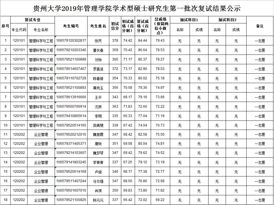 贵州大学2019年管理学院学术型硕士研究生第一批次复试结果公示