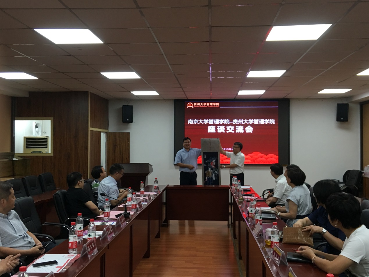 会上,李烨院长对王跃堂院长一行到访管理学院表示欢迎。李烨院长向南京大学管理学院的嘉宾们介绍了贵州大学的发展历程及管理学院的现状、学院发展的总体思路、师资队伍结构、学科专业及服务地方经济建设等相关情况。王婷副院长介绍了官方网站在科研及国际交流方面的情况;周莉莉副院长介绍了官方网站研究生学位论文管理及EMBA/MBA的发展情况;宋山梅副院长介绍了官方网站本科教育在教学质量方面等的情况。王跃堂院长介绍了南京大学管理学院的基本情况,重点介绍了南京大学管理学院学科发展及师资培养的具体办法。随后双方就学术科研、教学、人才培养、等方面进行了交流探讨。最后李烨院长向王跃堂院长重点介绍了贵州大学及管理学院设立科研特岗的具体情况,希望双方在科研、师资培养等方面建立战略合作关系,王跃堂院长表示高度赞同。会后,李烨院长向王跃堂院长赠送了礼品并合影留念。