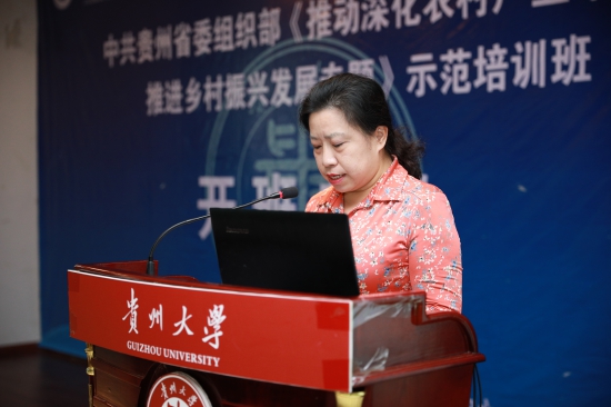 贵阳市农业农村局副局长彭玉荣代表学员发言。她希望全体学员在培训中能够学有所获,学有所长,不断增强自身的理论武装,打牢实施乡村振兴的思想根基,增强道路自信、理论自信、制度自信、文化自信。