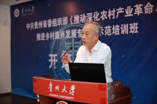 贵州大学校长宋宝安致辞,他说本次培训旨在通过进行系统理论培训,帮助基层干部把握乡村振兴的核心要义、目标精髓,把思想引领变为行动自觉。通过理论培训、专题培训、示范班培训、参观学习、研讨交流等方式,不断提升广大基层党员干部对乡村振兴战略的认识,提升广大基层党员干部在乡村振兴中干事创业的激情和能力,促进基层党员干部真正在学懂弄通、指导实践、推动振兴上下功夫,不断增强运用科学理论解决乡村振兴实际问题的能力,为乡村振兴提供干部队伍保障。