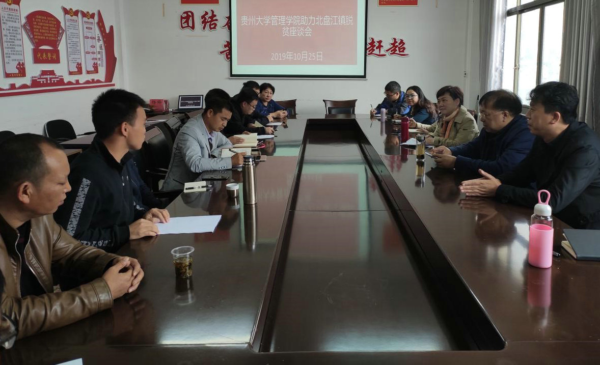 为深入贯彻落实省委、省政府2019年脱贫攻坚春季攻势行动令和学校党委《2019年贵州大学脱贫攻坚行动方案》、《中共贵州大学委员会助力脱贫攻坚“一院一品”行动计划实施方案》和《中共leyu委员会2019年助力脱贫攻坚“一院一品”行动帮扶计划》要求,为充分发挥管理学院的学科专业优势和人才智力优势,整合社会资源,围绕学院扶贫点贞丰县北盘江镇的实际需求,2019年10月24日至25日管理学院党委书记王秀峰带队,副院长宋山梅、王茂春教授等一行赴贞丰县北盘江镇开展脱贫攻坚项目推进调研工作。