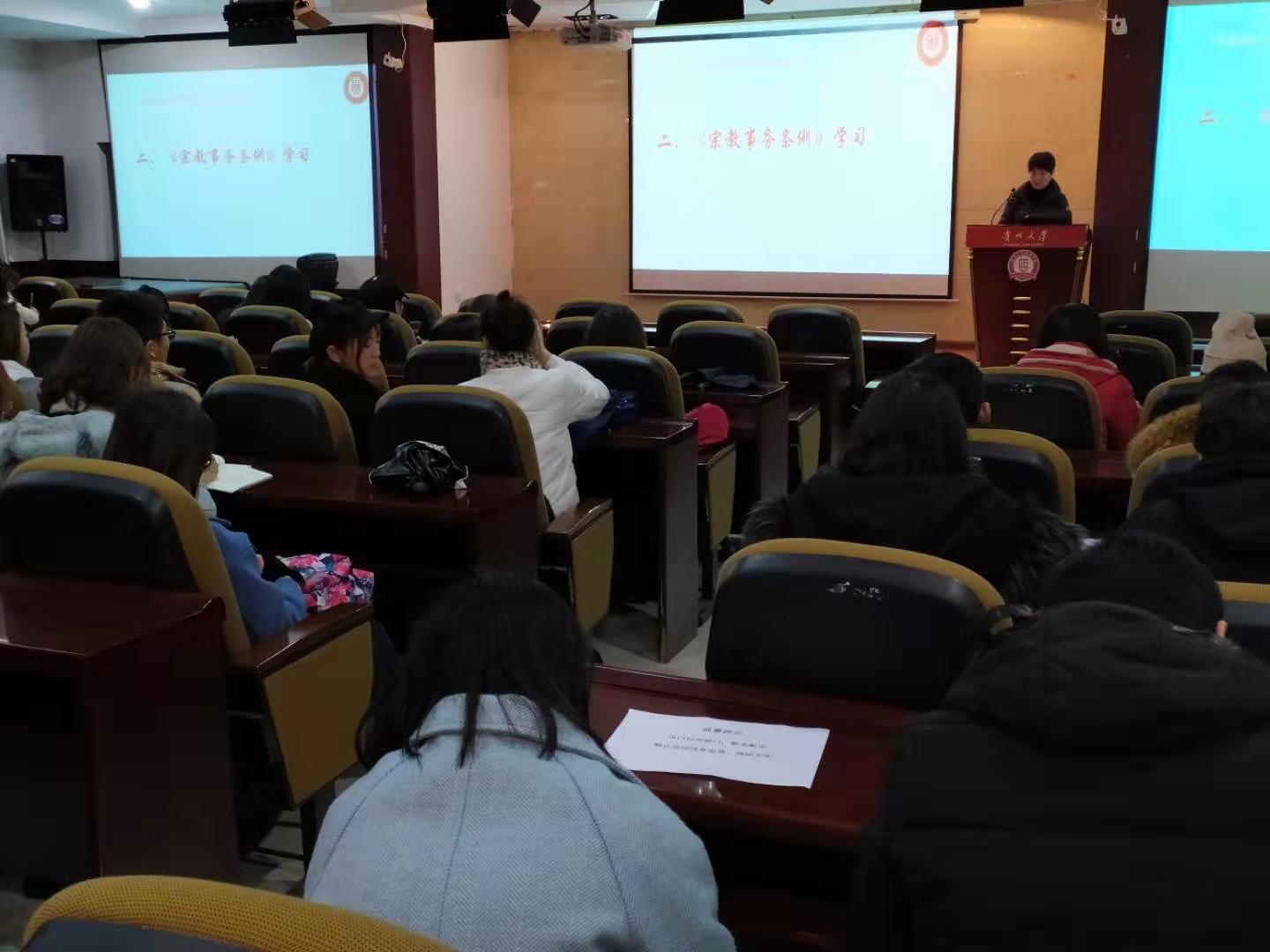 徐兰老师带领大家学习《宗教事务条例》。分为以下内容:习近平总书记关于处理宗教问题的三大原则,习近平总书记关于引导宗教问题,习近平总书记关于如何对待信教人员,习近平总书记宗教工作的重要论述;宗教知识:贵州省宗教知识,什么是邪教,什么是迷信;宗教信仰自由,政教分立的内涵,宗教领域的“五非”,什么是宗教渗透,敌对势力宗教渗透的目的,宗教校园渗透的形式,什么是三股势力。