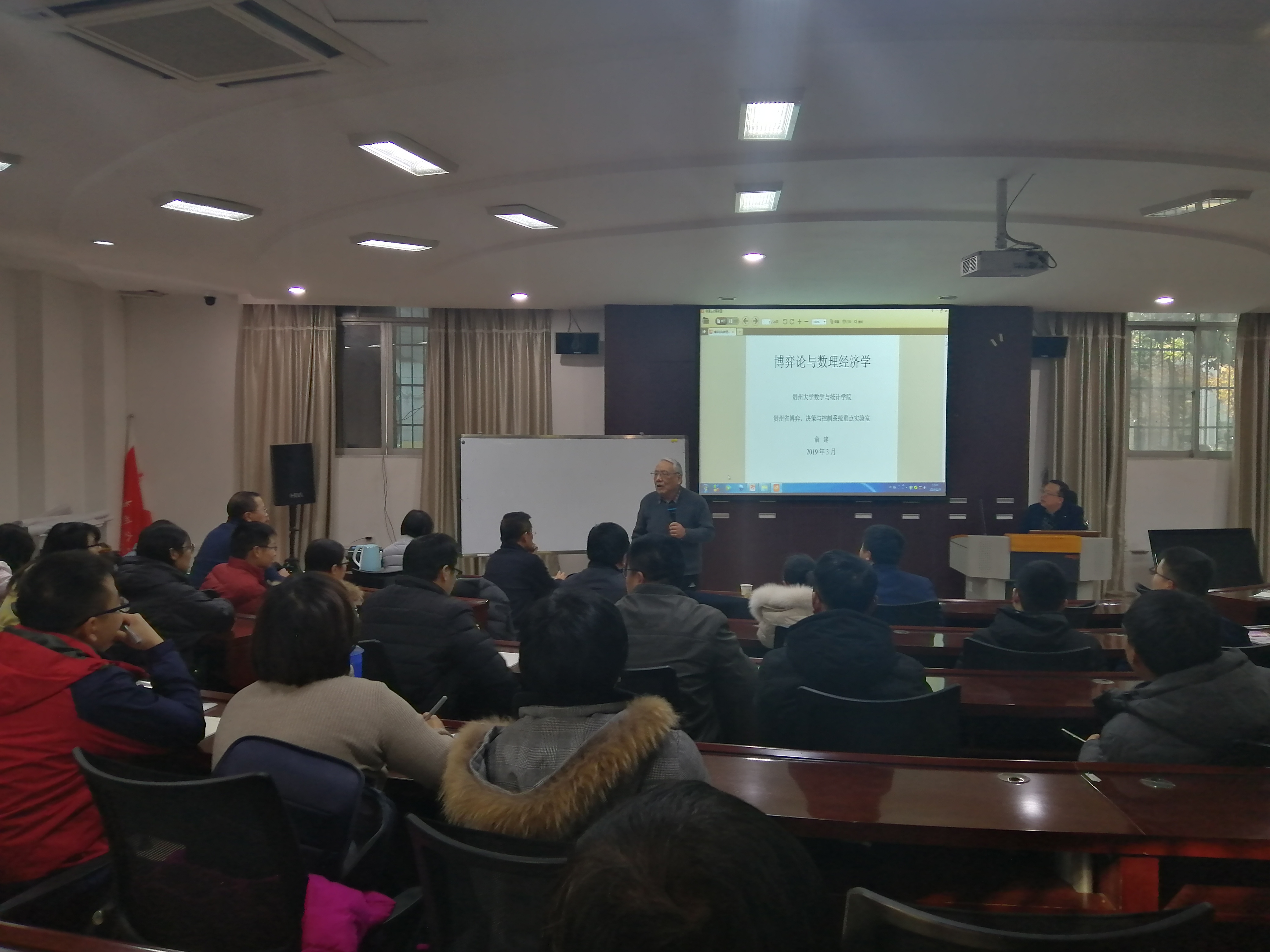 12月9日下午15:00,贵州大学数学与统计学院俞建教授莅临leyu,在管理学院一楼圆形教室报告厅做了题为“博弈论与数理经济学”的专题讲座。讲座由管理学院副院长王婷主持,管院部分教师及2018级全体研究生到场聆听。