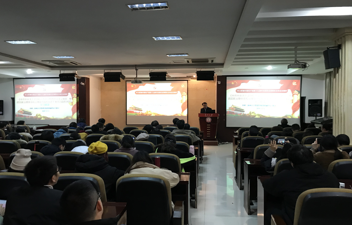 2019年12月5日中午13:30,学院在致远楼三楼报告厅开展形势政策教育。学院党政领导班子、全体教职工及学生正式党员参加会议。本次会议主题学习《中共中央关于坚持和完善中国特色社会主义制度,推进国家治理体系和治理能力现代化若干重大问题的决定》,会议由学院党委书记王秀峰教授主持。
