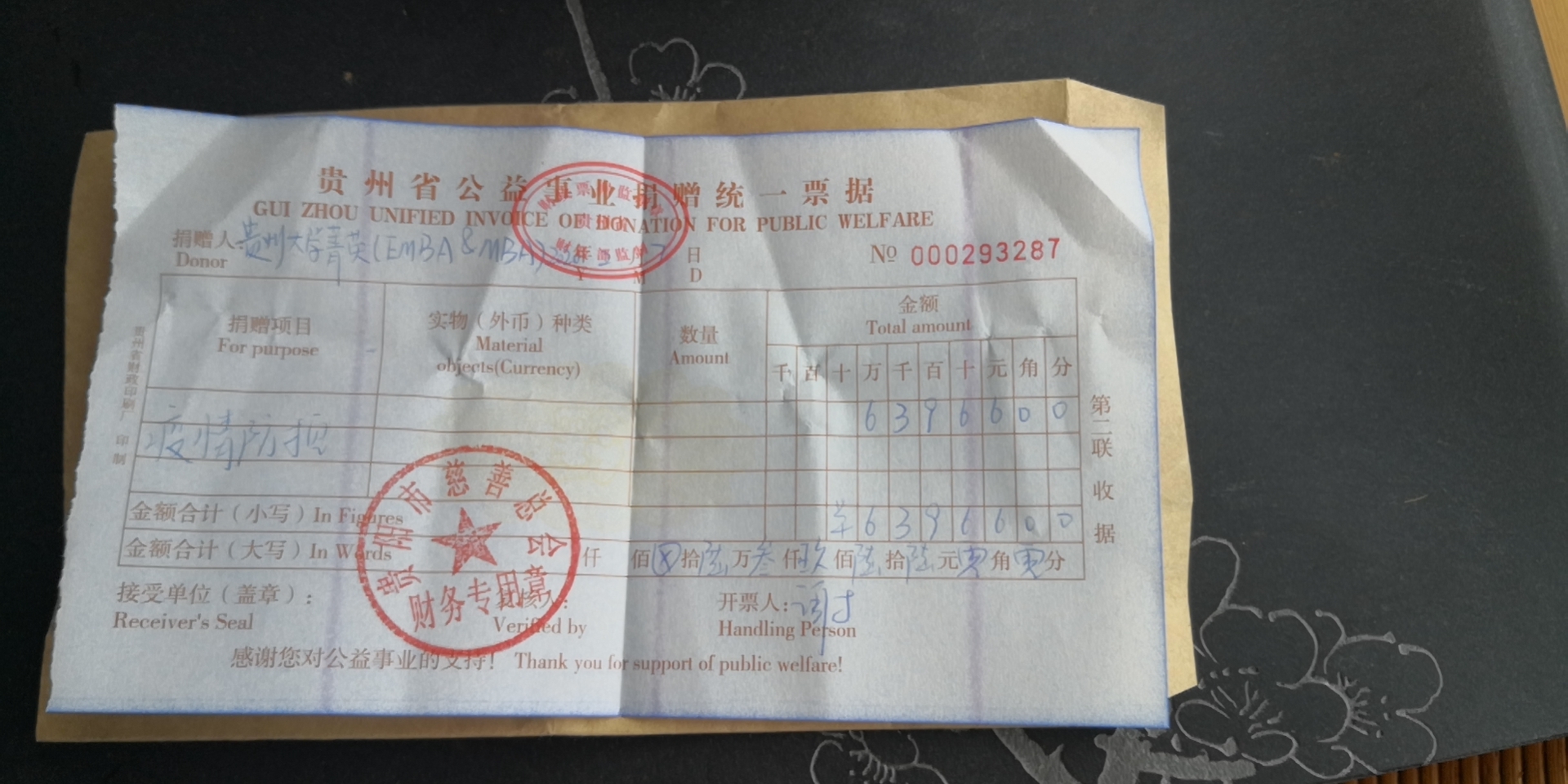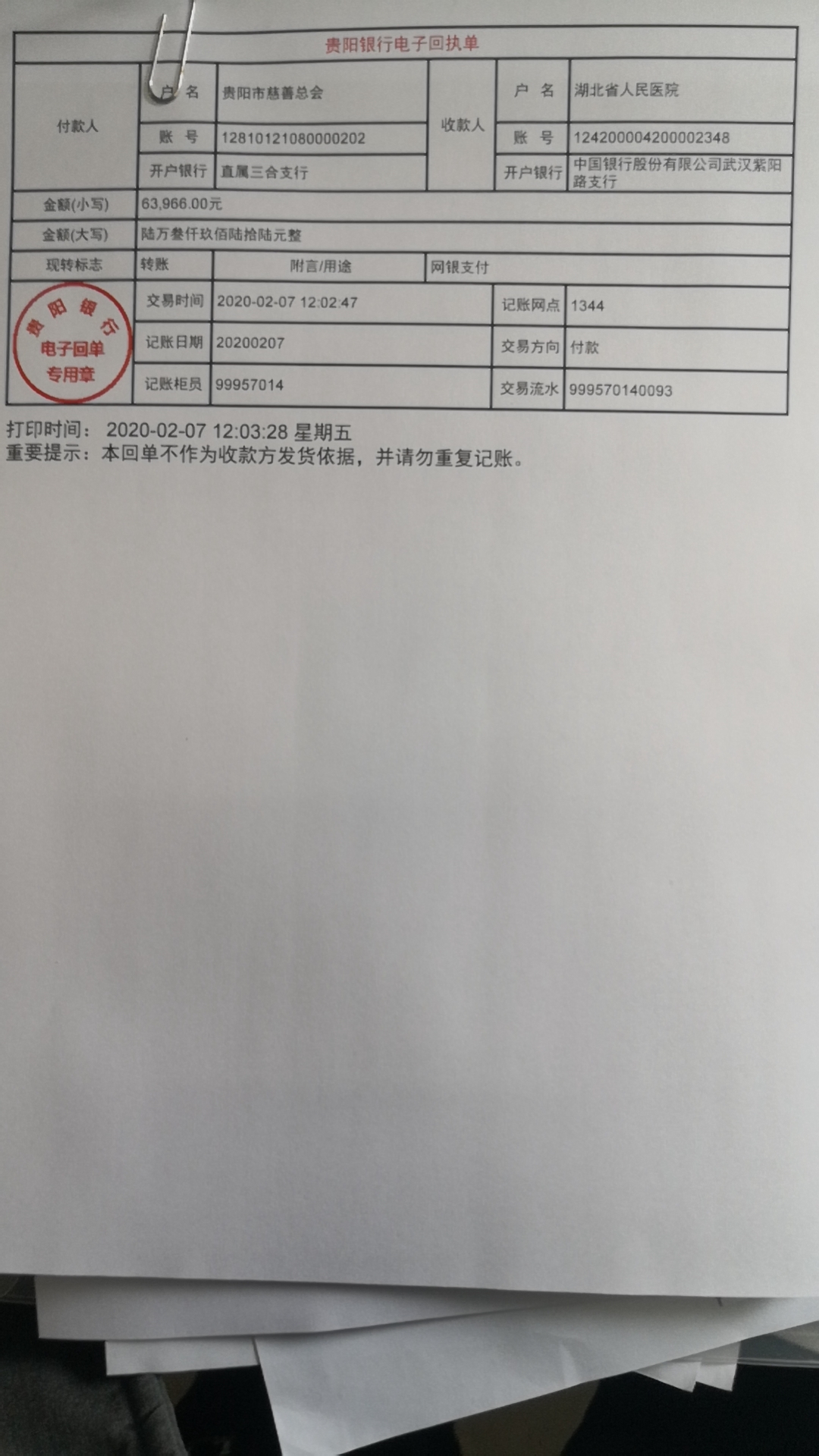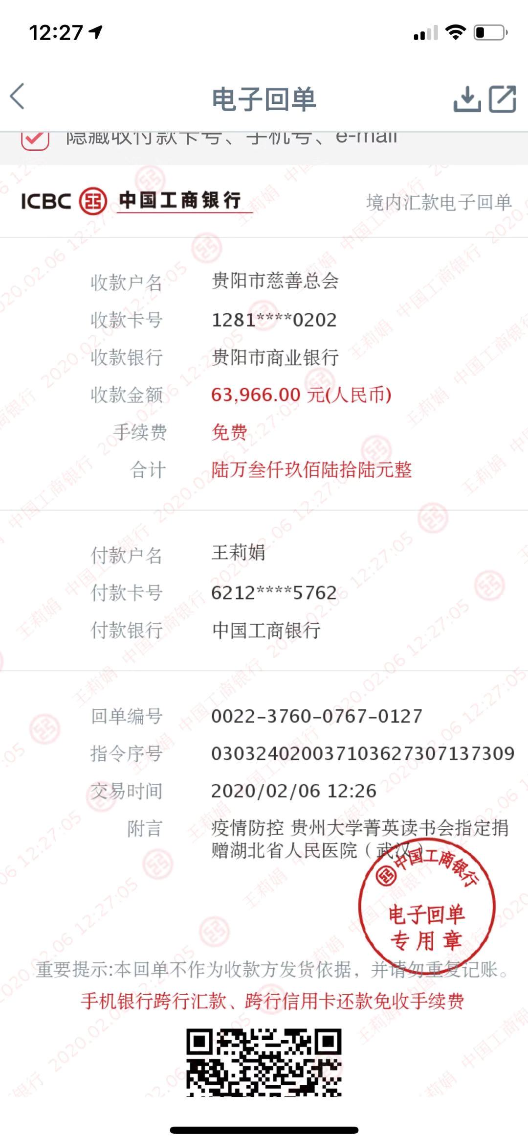 读书会向贵阳市慈善总会转账凭证 和 贵阳市慈善总会向武汉大学人民医院(湖北省人民医院)转账回执单