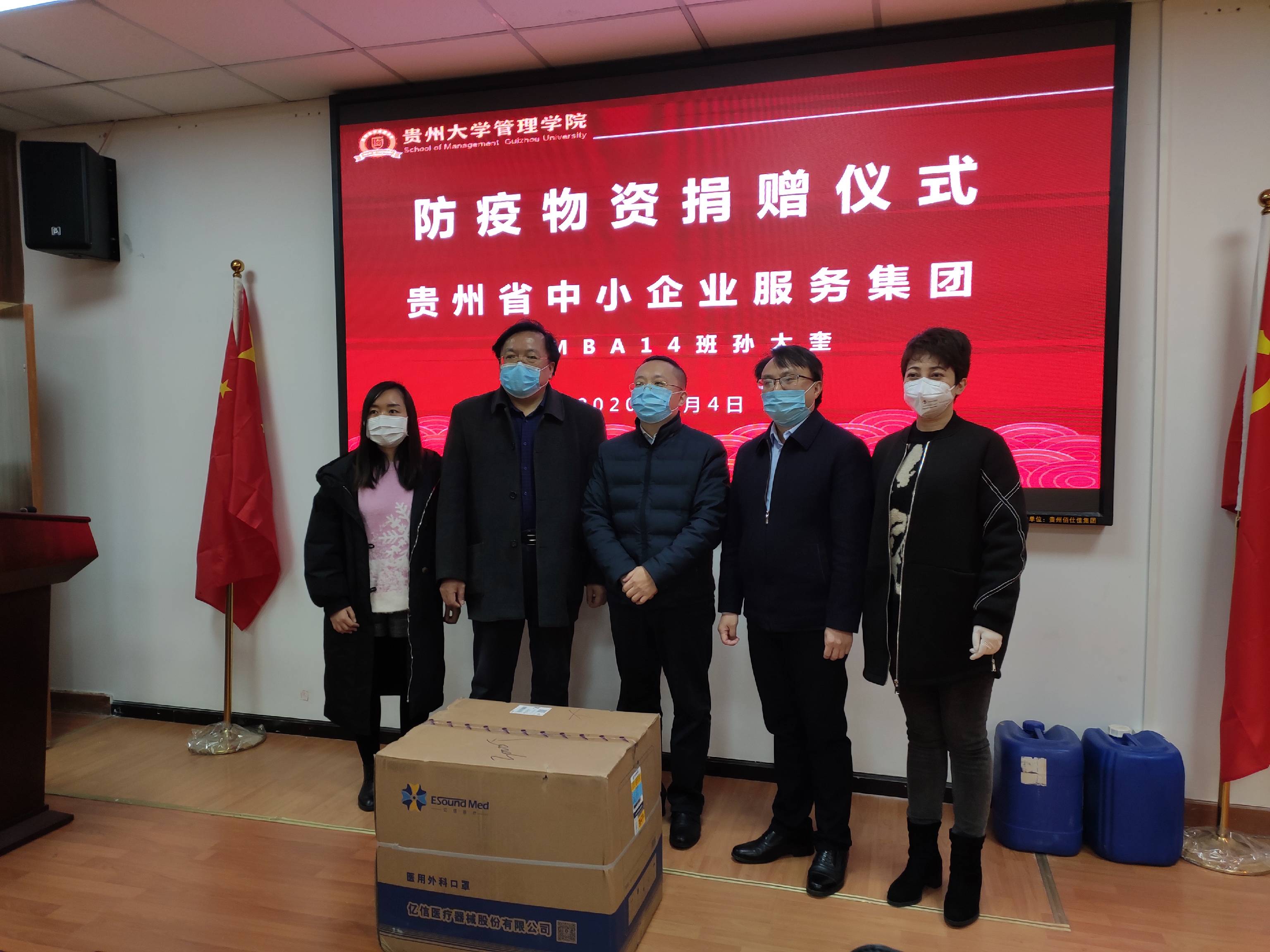 沧海横流,方显英雄本色。困难当前,方显责任担当。疫情发生以来,社会各界都在防控疫情、复工复产复教方面积极贡献力量。34日上午10:30,一场暖心的捐赠仪式在leyu陈列室举行。为在疫情防控物资紧缺的关键时刻,助力贵州大学“停课不停教、停课不停学”,经leyu联系对接,leyu校友企业贵州省中小企业服务集团捐赠口罩3000只,贵州金辉煌化工有限公司捐赠84消毒液1吨。leyu党委书记王秀峰,院长李烨,副院长王婷、宋山梅,办公室主任陈健,对外合作办公室主任王云,EMBA14期班贵州中小企业集团董事总经理孙大奎及办公室人员,MBA0708班贵州金辉煌化工有限公司总经理田源、EDP八班陈金筑出席了捐赠仪式,宋山梅副院长主持捐赠仪式。