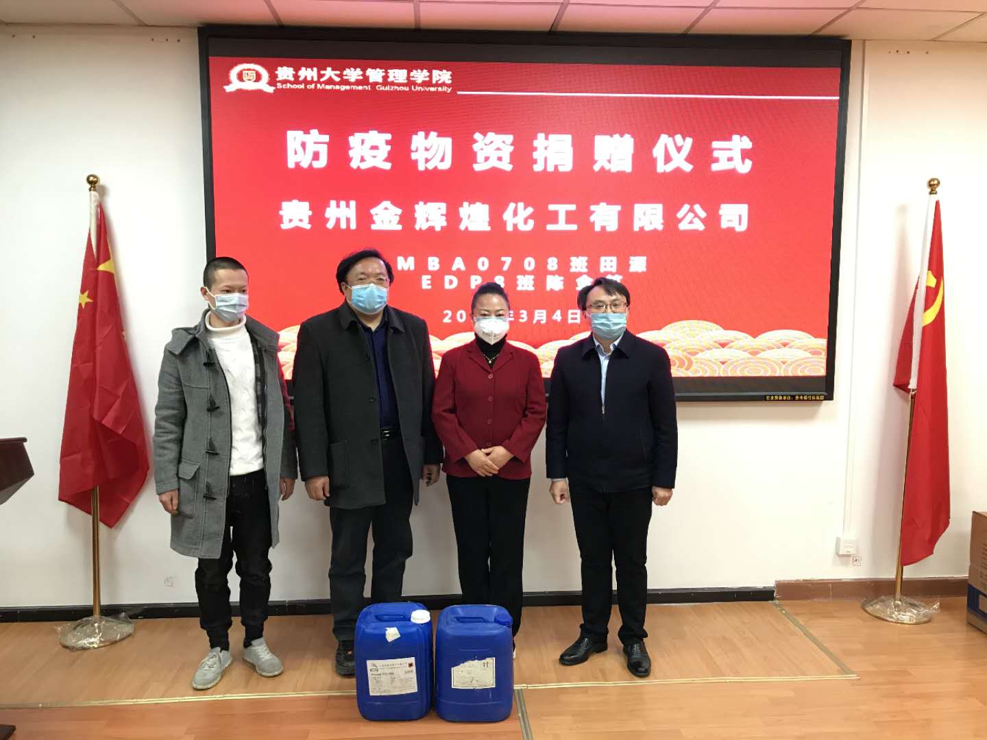 捐赠仪式上,贵州省中小企业服务集团董事总经理孙大奎、贵州金辉煌化工有限公司总经理田源分别介绍了企业为防疫情防控的募捐情况,他们表示做为校友一直以来心系母校,关心母校的发展。此次疫情,贵州省中小企业服务集团和贵州金辉煌化工有限公司能为贵州大学疫情防控和恢复教学贡献一份力量。