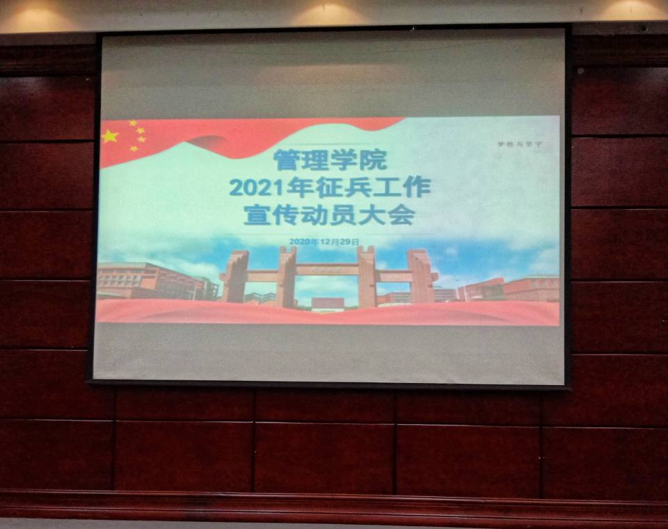 为响应国家新时代号召,深入落实征兵工作。2020年12月29日下午16:40,管理学院2021年征兵工作宣传动员大会在东校区一号行政报告厅举行。贵州大学学生处副处长张瑞良,管理学院党委书记王秀峰,管理学院副院长罗敏、周莉莉、宋山梅,管理学院全体辅导员、教学科老师、各班班主任和管理学院2018级、2019级全体适龄男同学参加了本次动员大会,本次动员大会由院党委副书记洪影秋主持。