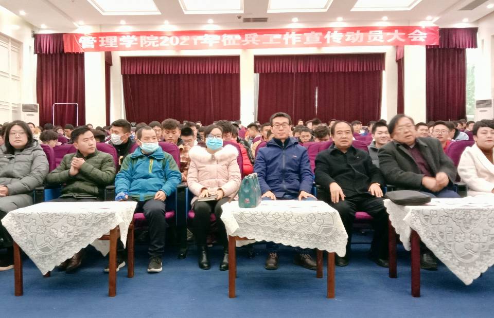 为响应国家新时代号召,深入落实征兵工作。2020年12月29日下午16:40,管理学院2021年征兵工作宣传动员大会在东校区一号行政报告厅举行。贵州大学学生处副处长张瑞良,管理学院党委书记王秀峰,管理学院副院长罗敏、周莉莉、宋山梅,管理学院全体辅导员、教学科老师、各班班主任和管理学院2018级、2019级全体适龄男同学参加了本次动员大会,本次动员大会由院党委副书记洪影秋主持。