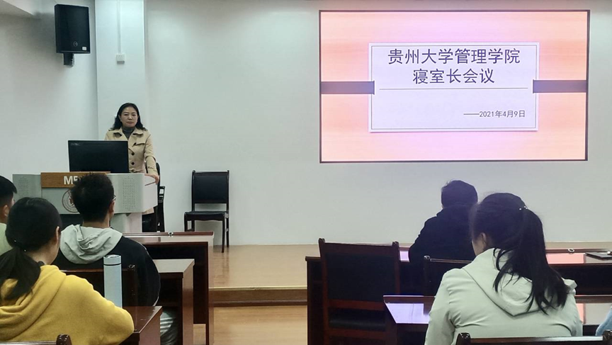 2021年4月9日中午12:50,管理学院于慎思楼二楼MBA报告厅召开寝室长会议,管理学院党委副书记洪影秋老师,学生科长芮丽华老师,向珂莹老师,车婧娴老师,两百余名寝室长出席会议。会议由陈黔江老师主持。