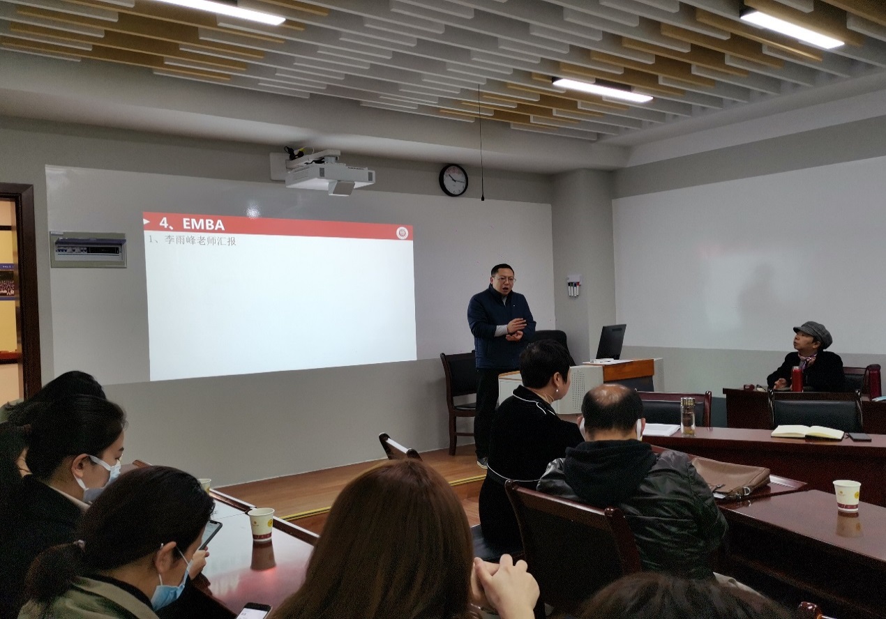 接着由MBA中心副主任何跃勇老师和EMBA中心主任李雨峰老师分别对近期的招生工作、学位答辩情况及学生活动做详细汇报。