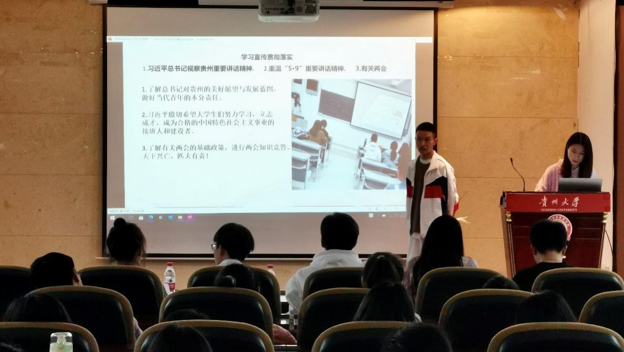 活动开始,朱洋洋同学简单介绍此次活动的会场纪律,评分标准以及奖项设置。随后,各团支部依据抽签序号上台展示各班级成果。同一个主题,不同的风采,各支部通过视频资料分享,知识问答,义务劳动,合唱,篮球联赛等丰富的活动形式,化古板为生动,激发同学们的爱国热情,也展现了班级凝聚力。