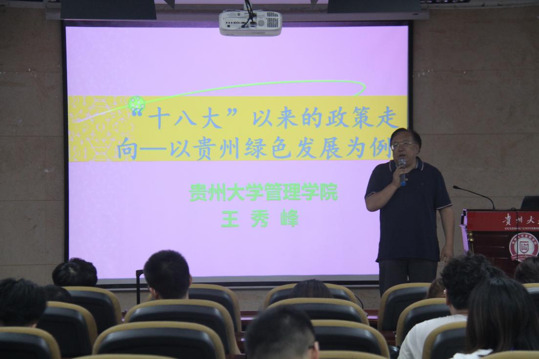 王秀峰围绕绿色发展背景、理论与实践、贵州经济绿色发展水平测度、贵州经济绿色发展环境条件、贵州绿色经济发展战略方案和发展的路径与保障体系构建等方面并通过贵州省与全国省均绿色化、工业固体废物产生量和林业投资额相比和湄潭县七彩部落的创意农业等案例,为大家讲述了党的十八大以来贵州翻天覆地的变化史,展示了贵州省在生态文明建设上取得的成就,展现了贵州省产业发展绿色化水平。