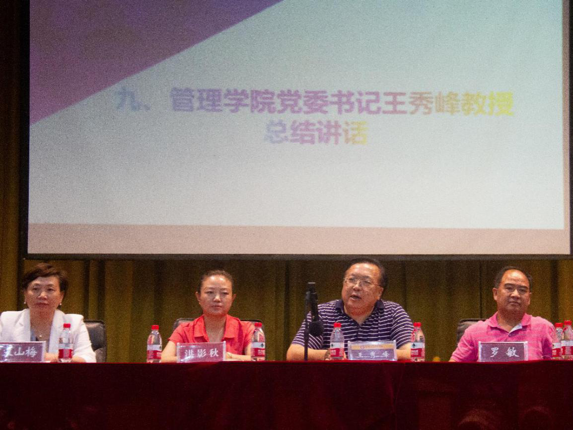 最后,管理学院党委书记王秀峰教授进行总结讲话。王书记向同学们出要求:学院和同学们在今后的工作学习过程中要做到‘高质量进来,高质量出去’的目标,响应国家号召,在今后相当长的一段时间内保持高质量发展;国家有四个自信,同学们老师们也要有自信,相信贵州大学,相信管理学院,也要相信自己。有了自信,再努力去认真做事,才能达到事半功倍的成果;要求同学们要树雄心,立壮志,不要荒废大学时光,努力全面提升综合素质,不断追求进步学习管理学科,锻炼自己社交能力与组织能力是十分重要的,无论遇到什么困难或挫折,要拿出十二分精力尽力努力应对和解决。王书记提出:管理学科在社会发展中越来越重要,学好管理学未来是十分有益的,社会也正越来越需要管理学专业的优秀人才,国家发展现代化主义强国,实现强起来、富起来的过程中,需要管理专业学子积极响应,努力建设,因此我们一定要有自信,在遵守基本的纪律法规,提高安全意识的基础上不断付诸努力。