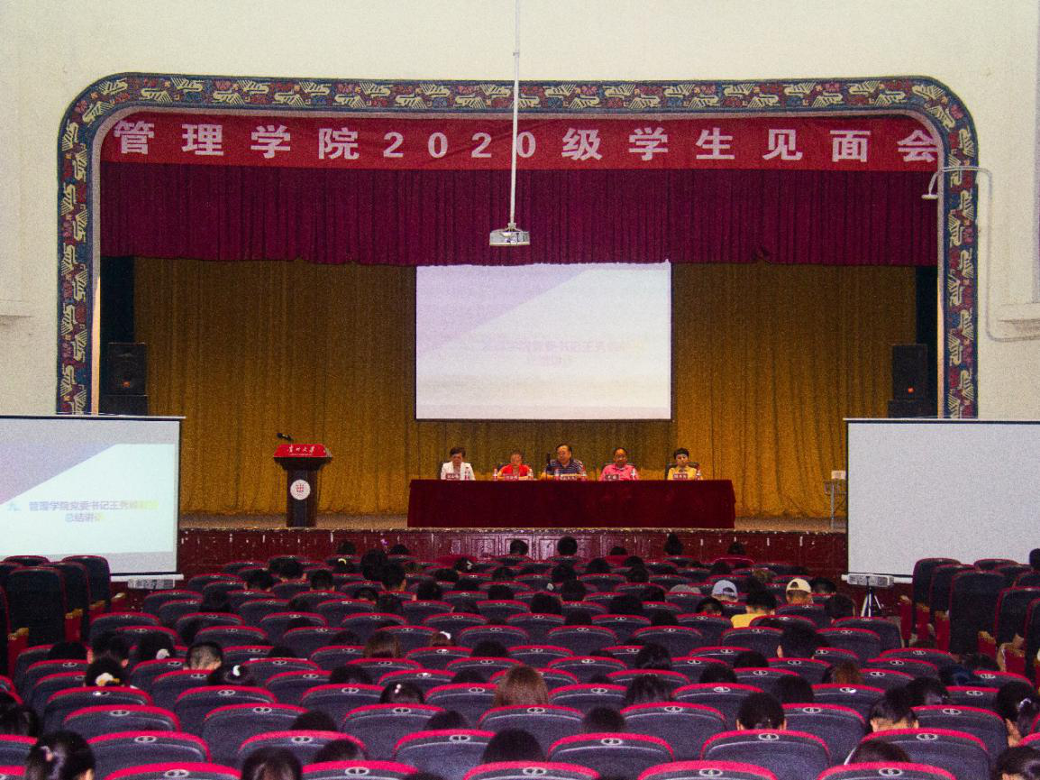 9月8日中午12:40,管理学院在东校区(原北区)大礼堂举行了2020级学生见面会。出席大会的有管理学院党委书记王秀峰,管理学院党委副书记洪影秋,管理学院副院长罗敏、周莉莉、宋山梅,管理学院各科室负责人、学生科全体辅导员及2020级各班班主任。大会由学生科科长芮丽华老师主持。