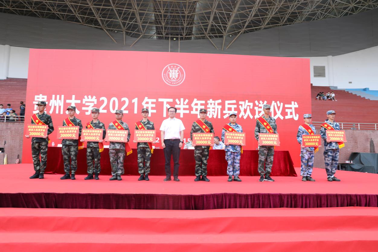 欢送仪式在升国旗、奏唱中华人民共和国国歌中拉开序幕。贵阳警备区政委王文建宣读2021年下半年贵州大学定兵名单,李建军书记为入伍学生代表颁发“书记校长特别嘉奖·应征入伍奖学金”。参会领导及嘉宾为入伍学生佩戴光荣花。