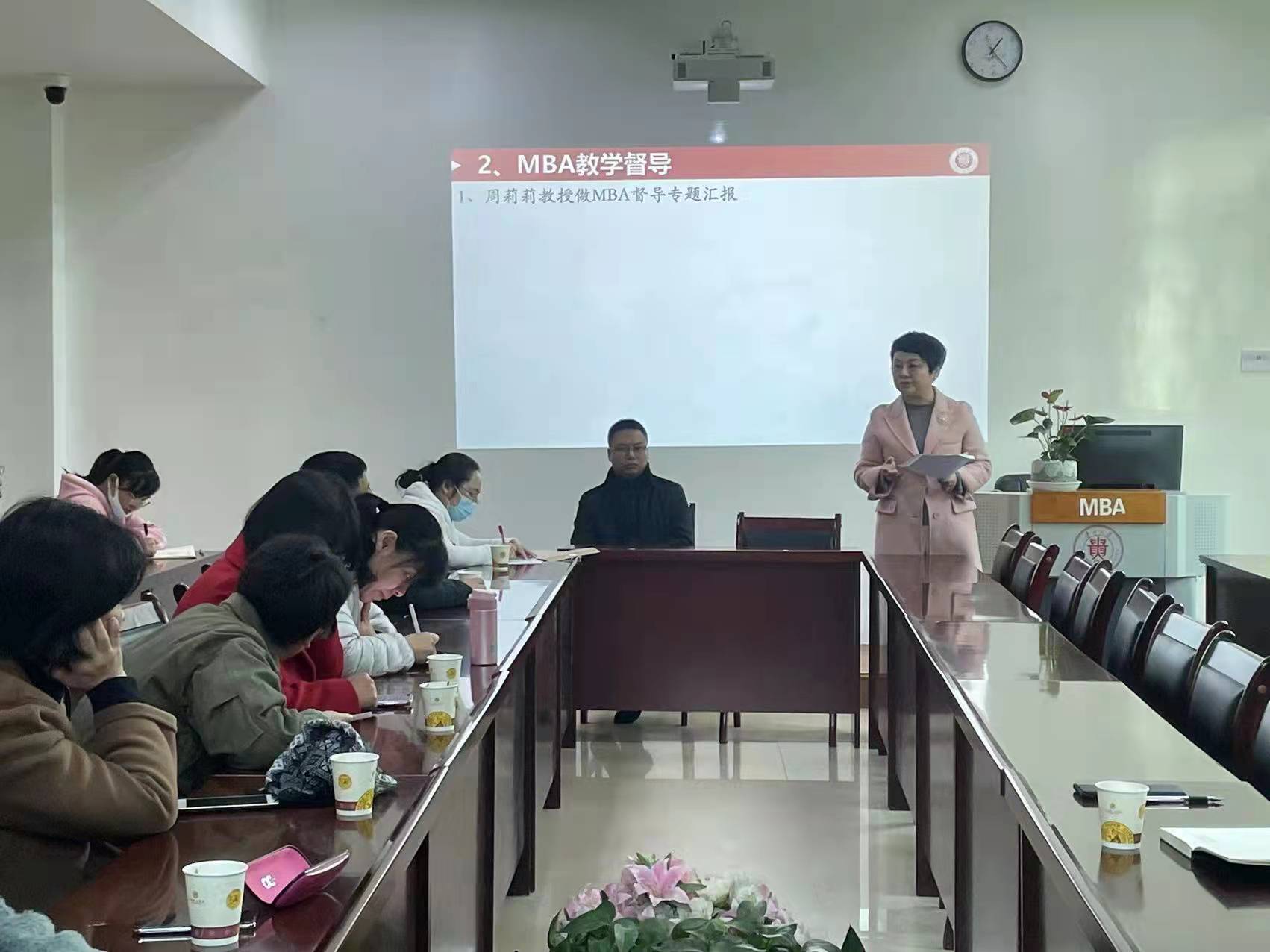副院长周莉莉教授做了MBA教学督导专题介绍。内容围绕教学秩序、学位论文质量监控、课程体系调整、中国高质量MBA/EMBA教育认证几个方面进行。